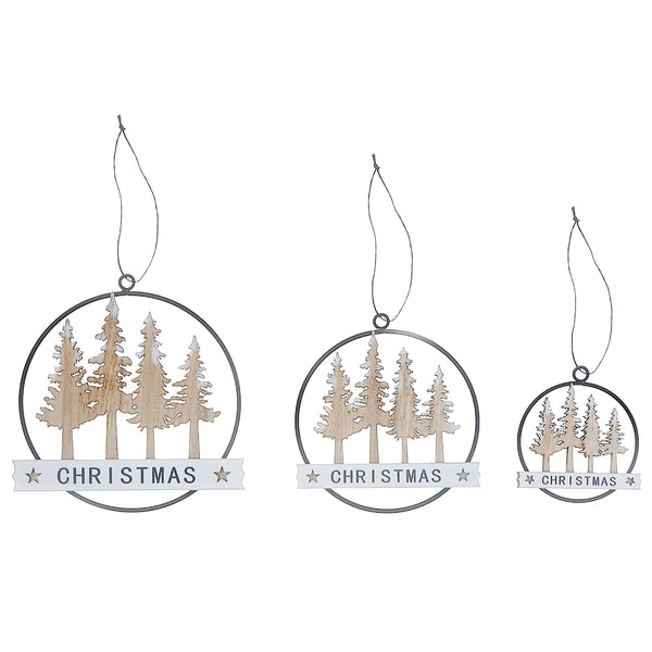 Metal Oval and Wood Tree Christmas Ornament Set Of 3